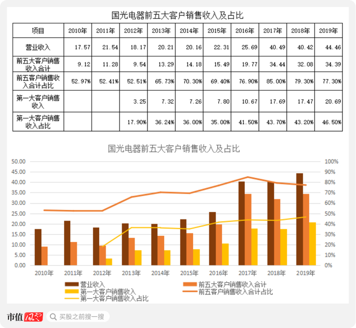 从上图可以清晰看出,国光电器对大客户的依存度非常高,尤其是对第一大客户的依存度很高,2013年以来有1/3的业务收入来自第一大客户,并且呈现逐年上升趋势,2019年更是接近一半。