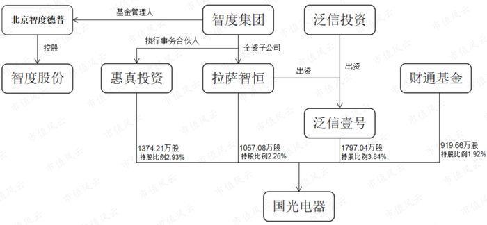 惠信基金及北京智度德广投资中心(有限合伙)是智度集团有限公司(以下简称“智度集团”)的一致行动人。本次股权转让后,惠信基金及北京智度德广合计控制广西国光投资69.19%股权,并通过后者控制国光电器13.47%的股份。