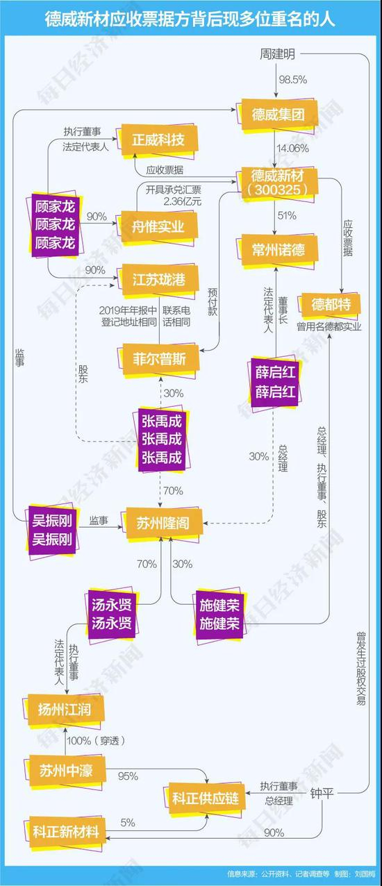 《每日经济新闻》记者连日调查发现,德威新材应收票据主要出票人过往通信地址与德威新材控股股东德威集团重复,部分出票人还与德威集团及实际控制人的民间借款相互担保。同时,上述企业背后股东、高管还出现同名者,甚至还有与上市公司子公司董事长同名的人。