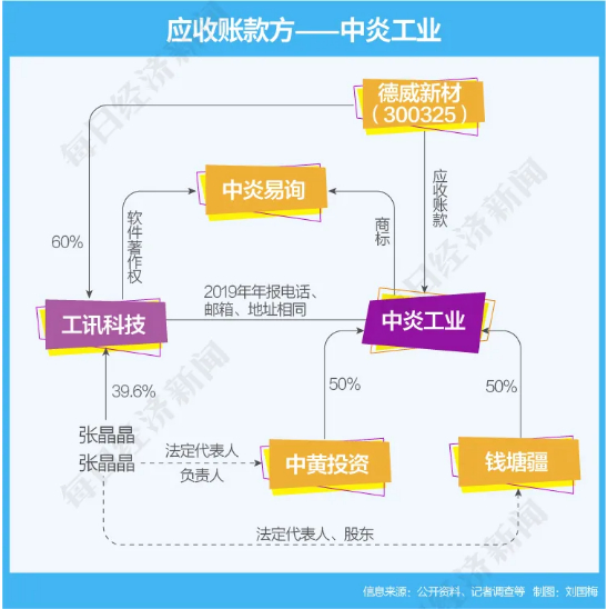 根据工商变更记录,2019年2月15日,中炎工业的法定代表人从张晶晶变更为张光起。2019年3月4日,中黄投资的法定代表人、负责人由张晶晶变更为张光起,且张晶晶退出股东之列。2019年4月8日,张晶晶不再是钱塘疆的法定代表人、股东。工讯科技现在的法定代表人也叫张晶晶,并且还是持股39.6%的第二大股东。德威新材则持有工讯科技60%的股份。
