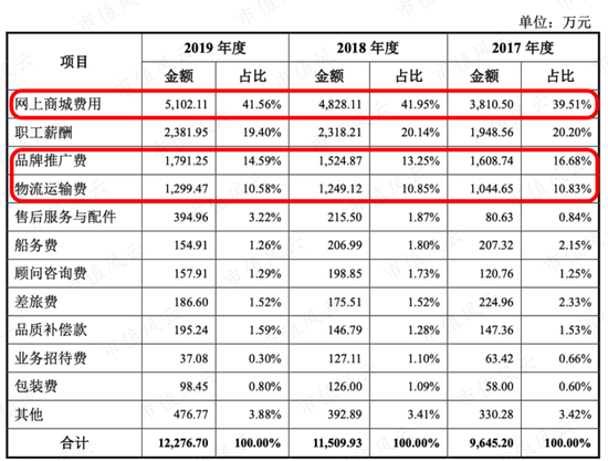 除职工薪酬外,北鼎股份的销售费用大头为网上商城费用、品牌推广费、物流运输费。