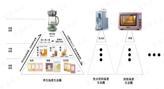 以养生壶为例,功能从最初的蒸增加了炖、蒸等多功能;使用场景从固定扩大到盛装、储存、携带,相应推出泡茶杯、分装杯、随身杯;为满足客户养生需求,还推出食材包。