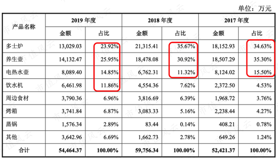 在这其中,北鼎股份卖得最好的是多士炉、养生壶、电热水器和饮水机,占了75%以上的收入。