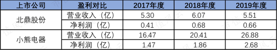 市值上来看,小熊电器2019年上市后股价涨了三倍,目前市值为160亿,而北鼎股份仅为64亿。