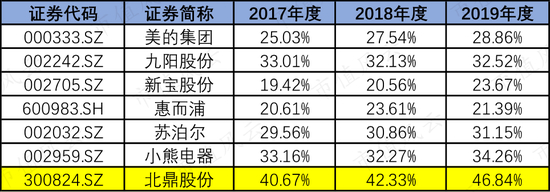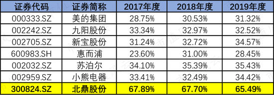 体现在毛利率上,北鼎股份整体毛利率均比同行业上市公司高。