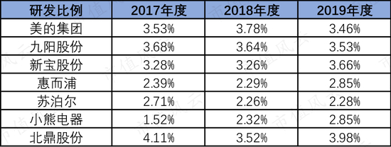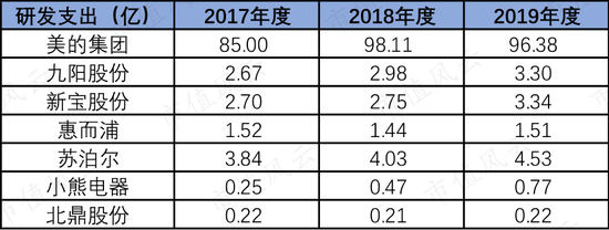 营业收入少,研发比例不拉开差距,在绝对值上就远远被同行甩在后面了。比如2019年底小熊电器的研发人员有241人,每年新品开发超过100款,而北鼎股份才有60人。