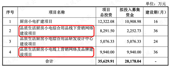 北鼎股份项目总投资预计为3.56亿,其中一半就用于线上线下营销,而产品扩充和研发设计加起来才1.74亿,这次IPO净募资额为2.82亿。