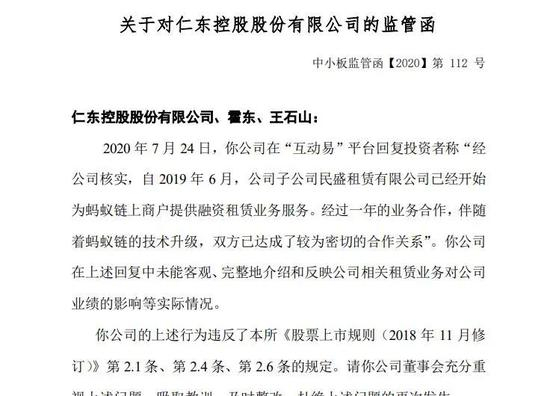 对于10月30日受到问询的海科金集团借款以及兴业银行3.5亿元贷款逾期等问题,仁东控股称,截至本年末,公司将分批次逐步偿还完成上述借款。截至2020 年 11 月 20 日,公司已经偿还0.8亿元,还款来源主要是大股东仁东信息对公司的借款。