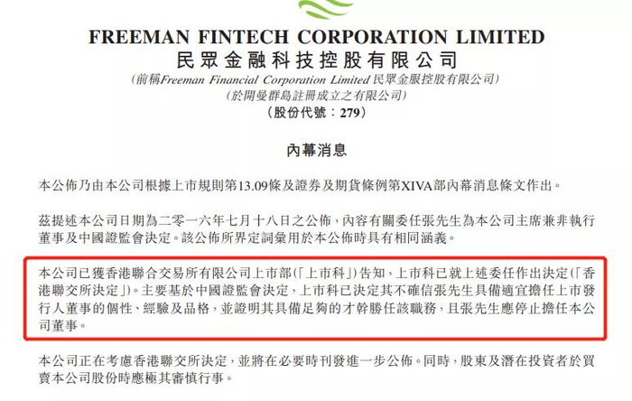 2016年底,因张永东此前曾在内地受到监管处罚,港交所也对其发出禁令,“不确信张先生(即张永东)具备适宜担任上市发行人董事的个性、经验及品格,并证明其具备足够的才干胜任该职务。”