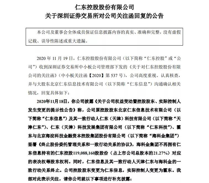公开信息显示,2019年7月29日,仁东控股原控股股东仁东信息及一致行动人天津仁东、仁东科技、霍东曾与国资背景的海科金集团签署股份委托管理协议,仁东信息、天津仁东与海科金集团签署了一致行动协议。2019年11月15日,随着协议正式生效,公司实控人由霍东变更为海科金集团。