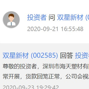 2020年9月,雪球上,有投资者问,双星新材会爆雷吗?——公司应收账款最大客户深圳市海天塑材,注册资金100万元,实缴资金无。社保人数25人。应收账款余额与年度销售额相当,也就是说收款账期差不多一年。对这样的经销商给了近一年的收款账期符合常识吗?
