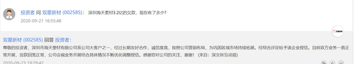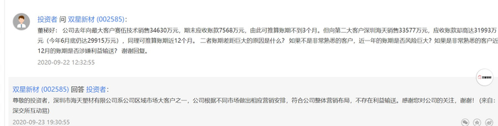 在公司“互动易”投资者与上市公司互动平台上,更有许多投资者担心双星新材的第一大客户——深圳市海天塑材有限公司(下称“深圳海天”)应收账款的回收风险。