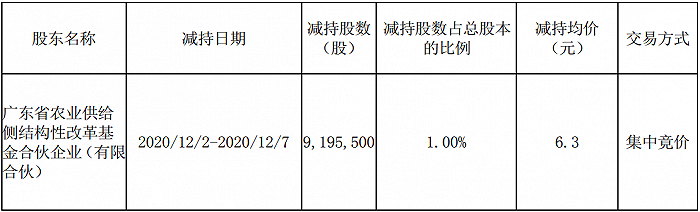 另一则是,国联水产持股5%以上股东广东省农业供给侧结构性改革基金合伙企业(有限合伙)在12月2日-12月7日以集中竞价方式减持公司919.55万股,占总股本比例的1%。减持后,广东省农业供给侧结构性改革基金持有股份占公司总股本的4.73%,不再是持股5%以上的股东。