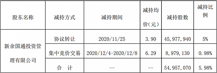 12月8日,国联水产披露了两则股东减持公告。一则是公司控股股东新余国通投资管理有限公司(下称国通投资)在11月25日至12月8日通过协议转让及集中竞价交易方式出售公司股份5495.71万股,占公司总股本的5.98%,本次减持计划已实施完毕。