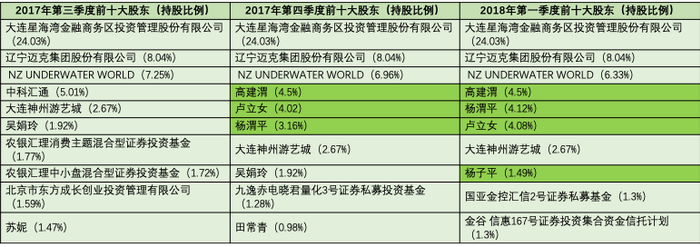2017年3季度-2018年1季度 大连圣亚前十大股东及持股比例。数据来源:大连圣亚公告,整理:崔浩