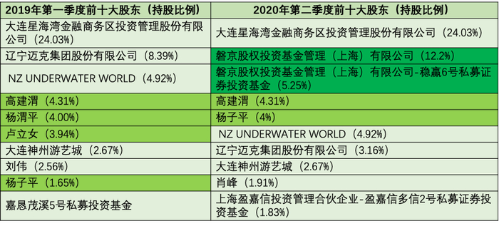 2019年第一季度,2020年第二季度前十大股东及持股比例。数据来源:大连圣亚公告,整理:崔浩