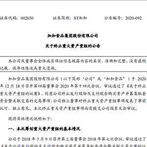 对于终止本次重大资产重组的原因,加加食品表示,基于本次重组方案较为复杂,公司尚未被撤销其他风险警示以及目前市场环境等原因,现阶段继续推行重大资产重组条件尚不成熟,经公司审慎研究,决定终止本次重大资产重组事项。