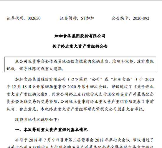 12月20日晚,加加食品(ST加加,002650)发布关于终止重大资产重组的公告称,终止收购大连远洋渔业金枪鱼钓有限公司(以下简称“金枪鱼钓”)100% 股权。