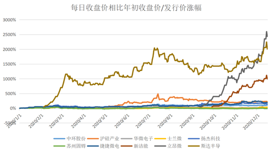 其中,立昂微于2020年9月11日上市,从发行价4.92元/股,最高涨至145元/股,截至2020年12月15日,立昂微市值已达500亿元。