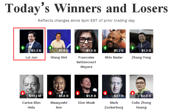福布斯实时富豪榜显示,今天雷军是全球富豪中最大的“赢家”,个人身价一天增加23亿美元,约合人民币150亿。