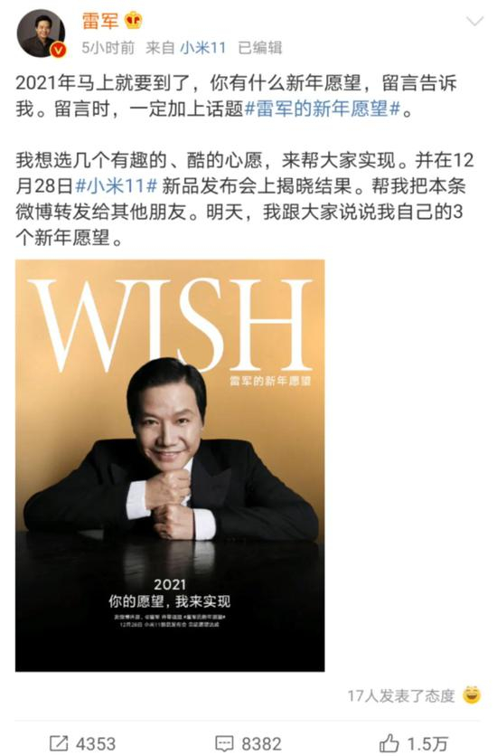 在小米股价破千亿美金的40分钟后,小米创办人、董事长兼CEO雷军发布微博,征集小米粉丝的新年愿望,并表示,12月24日,将公布自己的3个新年愿望。