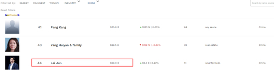 与此同时,据彭博亿万富翁指数显示,雷军身家263亿美元,超过张一鸣等人,成功挤进中国榜前十。