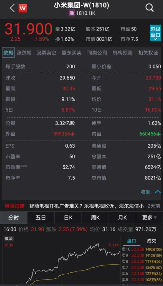 随后小米股价继续上扬,最高涨7.76%至32.35港元/股,临近尾盘涨幅有所缩小,最终收涨7.59%报31.9港元/股。股价创收盘历史新高,最新总市值8021亿港元,较前一交易日大增566亿元。