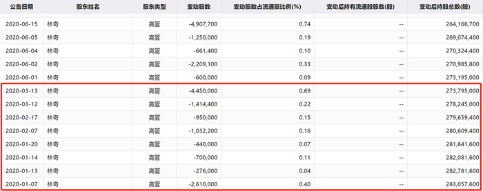 就在发布“业绩快报修正及致歉公告”,公司实际控制人林奇已经进行大笔套现,同花顺iFinD数据显示,仅2020年前4个月,林奇已经数次减持,合计套现约2.7亿元。