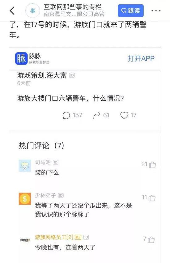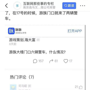 12月17日,有网友在公开社交媒体上称,游族网络所在的大楼门口停了六辆警车。之后,又有网友称警车已经连续出现两天。