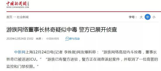 然而根据23日上海市警方通报,早在17日的17时,上海警方接到报警在医院就诊中发现林某(指林奇)好像中毒。这一说法显然呼应了17日游族网络所在大楼前停放数辆警车的信息。也就在游族网络自愿性信息披露公告发布后的第二日(12月24日),游族网络股价大幅下跌,最终跌幅达6.11%。
