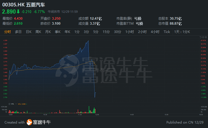 12月29日,五菱汽车开盘涨超12%,随后一路高走,不过,该股截至午间收盘突然直线跳水,从最高涨43%到午间收盘跌6.77%。盘中甚至甚至一度下跌10%。目前总市值89亿港元。