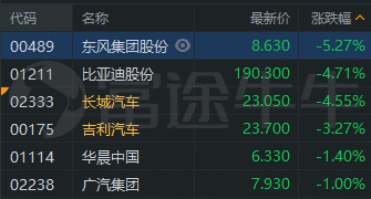 其他主要汽车股今日表现略显暗淡,此前涨势迅猛的个股遇到回调,比亚迪股份跌4.7%,吉利汽车跌3%,长城汽车跌4.55%。