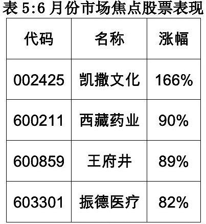 6月份,实际上是免税和头条概念带动下的多概念燥热期。包括免税、头条、医疗等多个板块都在市场情绪的加持下,走出一波小牛。创业板指表现尤其强势,代表个股如下:
