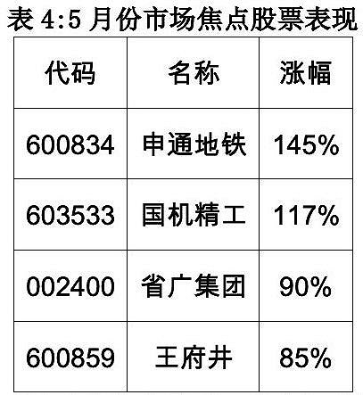 5月份,申通地铁因为收购半导体消息刺激,涨幅近145%;而王府井和省广集团则是从五月份开始,引领了免税和头条概念的上涨。