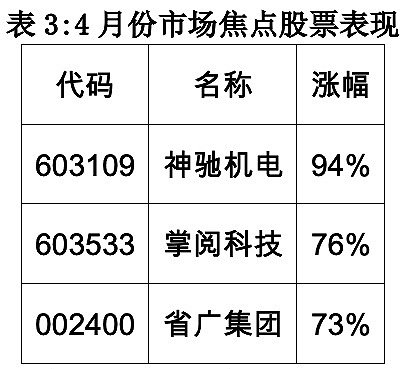 4月份,市场上涨的主线并不明确,当月并无涨幅超过100%的个股出现。但省广集团例外,4月份只是他的上涨初期。