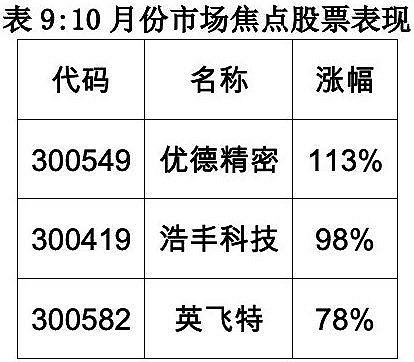 9月份,资金的焦点是在国防军工板块,新余国科完成了197%的上涨,带动多只军工板块个股上涨。