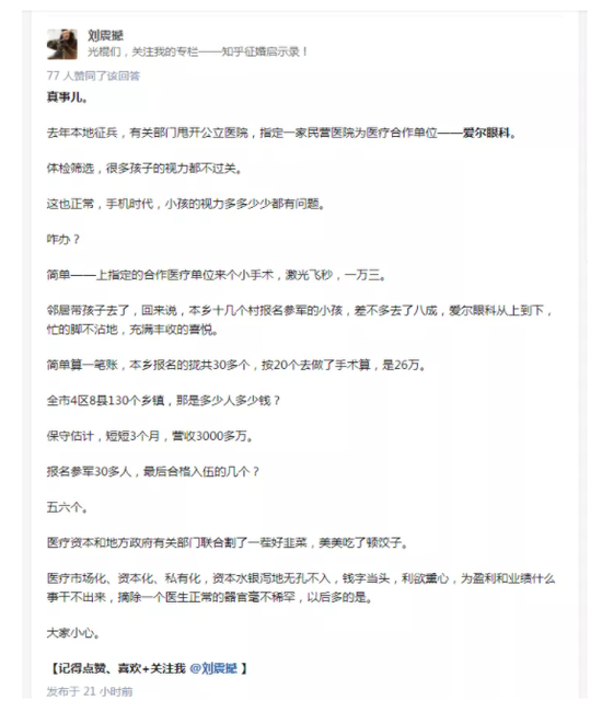 爱尔眼科甚至把手伸向了征兵环节。知乎上有人爆料: