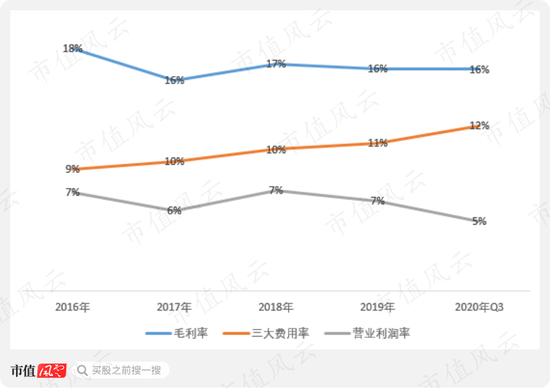 三大费用率(含研发费用)维持在10%上下,2020年前三季度达12%主要是疫情导致收入下滑导致的,这也最终导致营业利润率维持6%-7%。如下图: