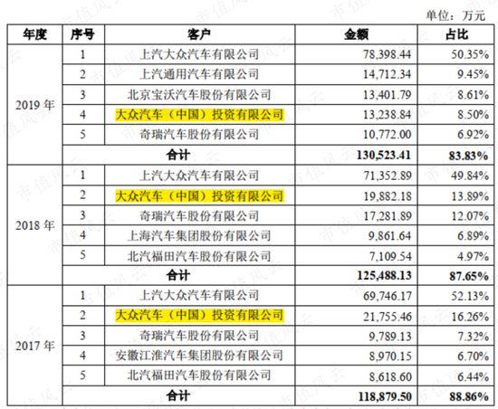 2016-2019年,对上汽大众的销售收入占比分别为45.96%、52.13%、49.84%和50.35%。