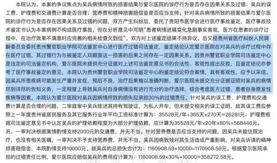 二审判决书显示,经贵州省医疗纠纷人民调解委员会委托贵州警官职业学院司法鉴定中心进行医疗过错司法鉴定,鉴定结论认定爱尔医院在对吴兵的诊疗过程中存在医疗过错,其过错行为与被鉴定人双眼盲这一损害的后果之间存在一定因果关系,最终爱尔医院对吴兵因病情所致的损失应承担30%的过错责任。
