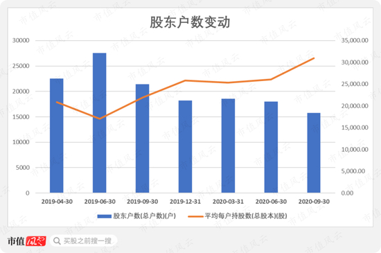 伴随股价上涨的,是逐步减少的股东户数,从2019年6月末的2.75万户下滑到2020年9月末的1.58万户,跌幅达42.71%。