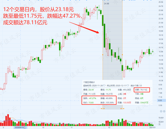 从11月26日至12月11日的12个交易日暴跌47.27%,几乎腰斩。