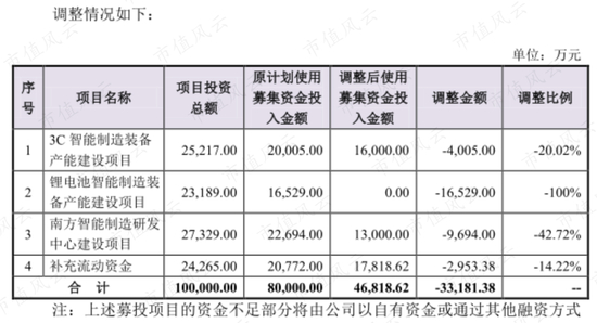 2017年8月28日,智云股份调整该部分募投资金的用途。砍掉了锂电智能项目,又将3C智能项目、南方智能项目使用募集资金投入金额分别由2亿元、2.27亿元下调至1.6亿元、1.3亿元,降幅分别为20%、43%,补充流动资金的金额则由2.08亿元减至1.78亿元,降幅14%。