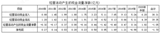 2010年到2019年,10年的时间里有5年经营性现金流净额为负值,累计经营性现金流净额—1.05亿元。