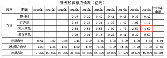 该科目也是在并入鑫三力后逐年增加,2019年达到4.63亿元,占当期流动资产的46%;存货明细中,发出商品增长最快,2019年达4.5亿元,也在当期计提跌价损失金额最多的一个细分。