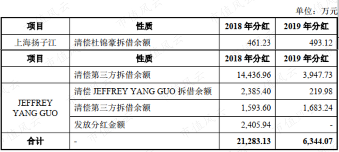 那怎么还呢?用艾力斯累计未分配利润分红偿还,2018、2019年累计向上海扬子江和JEFFREY YANG GUO累计分红2.76亿元。