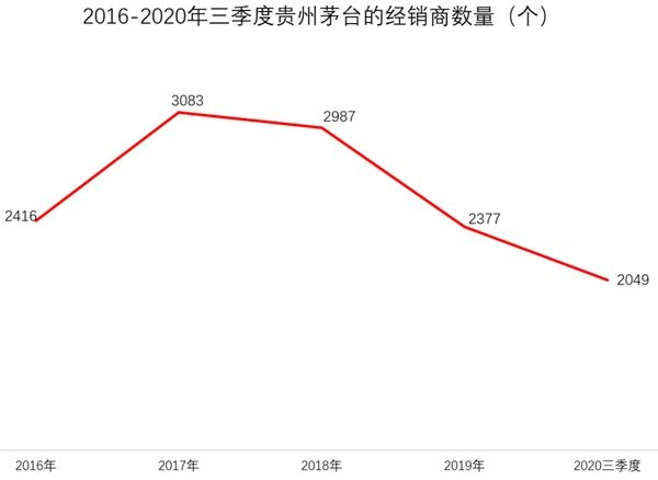 2020年前三季度,贵州茅台的国内经销商总数继续缩减,仅有2049家。