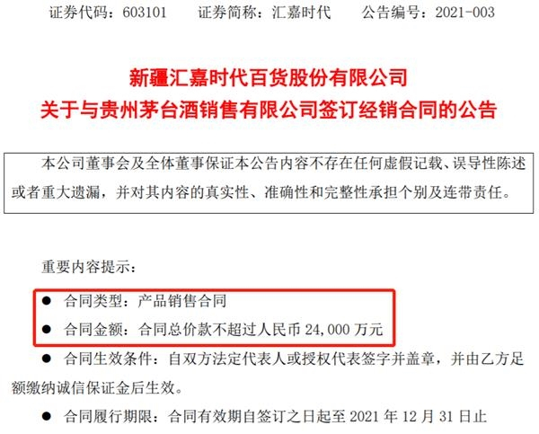 1月11日晚间,汇嘉时代(603101)公告,与贵州茅台酒销售有限公司签订经销合同,合同总价款不超过2.4亿元,本次交易旨在借助公司的销售平台将品质优秀且价格优惠的茅台系列产品推向新疆市场。