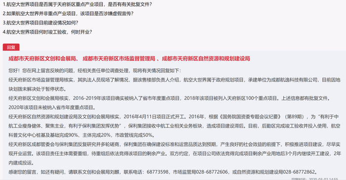 而根据天府新区相关主管部门的回复,成都航空大世界的建设单位反馈该项目责任主体需要重组,待重组后依法竞得该项目的剩余产业,将于3个月内继续开工建设,2年内建成投运。
