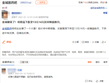 不过,也有股民认为,“金城医药结结实实爆了一个大雷!股价将中期调整,反复震荡下跌至13元14元横盘数月,下跌途中有反弹,但慎抢反弹。”